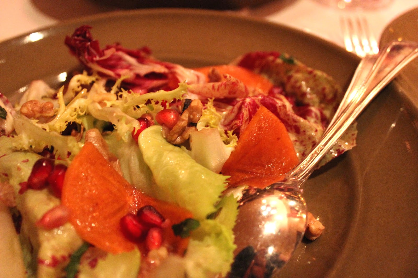 | 鸭农菊苣配扶余柿子,核桃,薄荷和佩科里诺干酪 |