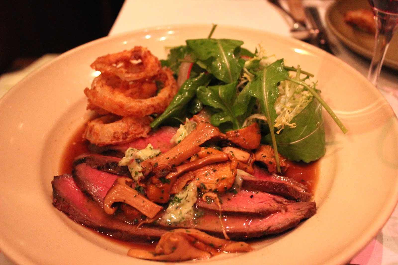 烤梅普尔溪牧场牛里脊配鸡油菌,百里香黄油,火箭沙拉 |